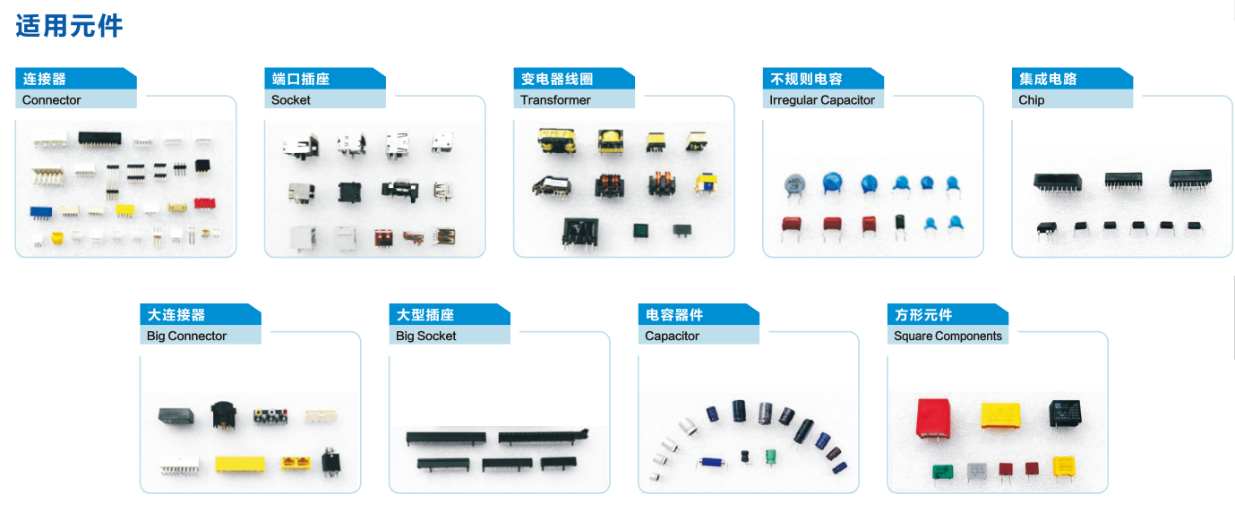 B&P異型元件插件機(jī),自動(dòng)更換合適的夾抓,插裝元件種類可達(dá)到24種,解決插件種類多、數(shù)量少問(wèn)題。