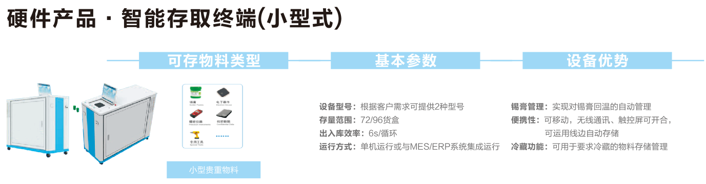 小型一對(duì)一智能存取終端,可實(shí)現(xiàn)對(duì)錫膏回溫的自動(dòng)管理,可移動(dòng),無(wú)線通訊、觸控屏可開(kāi)會(huì),可運(yùn)用線邊自動(dòng)存儲(chǔ)。可用于要求冷藏的物料存儲(chǔ)管理。