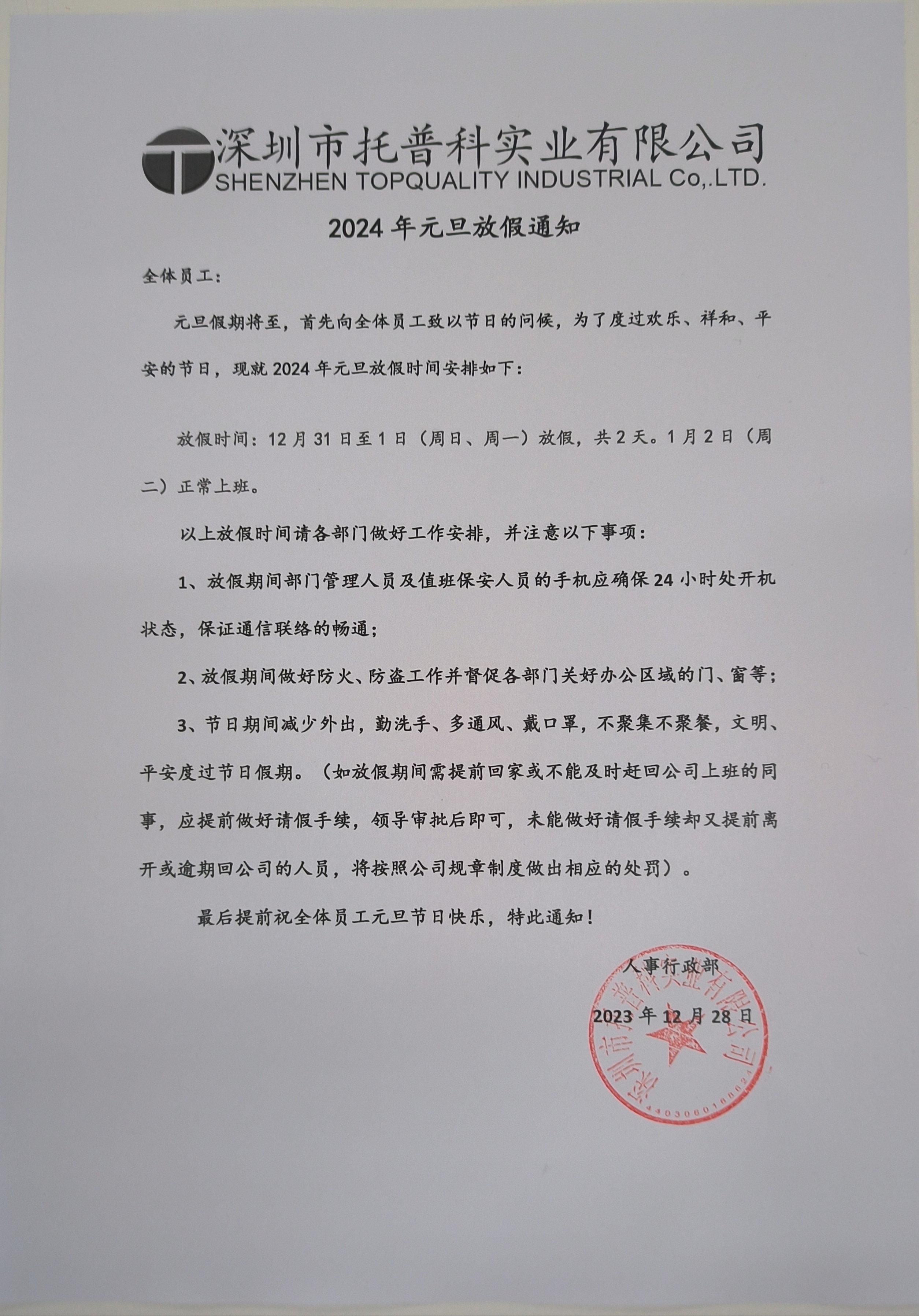 深圳托普科實業(yè)2024年元旦放假通知