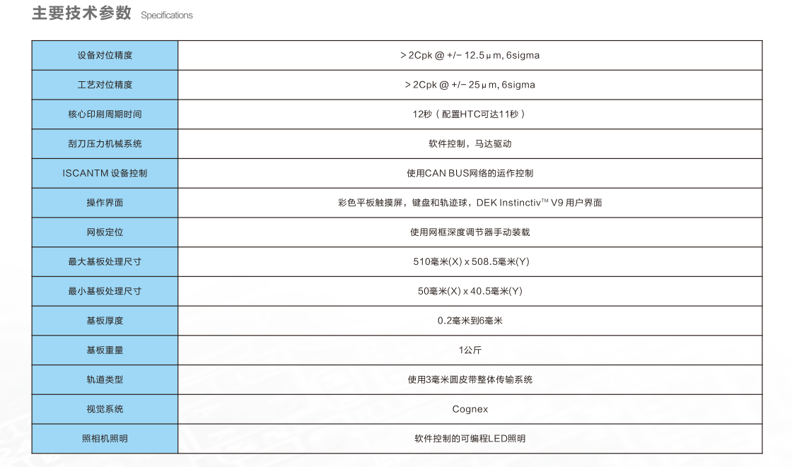 DEK全自動絲網(wǎng)印刷機具有先進的上視/下視視覺系統(tǒng),獨立控制與調(diào)節(jié)的照明高速移動的鏡頭。精確地進行PCB印刷電路板與網(wǎng)板的對位,從而將錫膏或紅膠按照網(wǎng)板的開孔精確的涂敷在印刷電路板上。